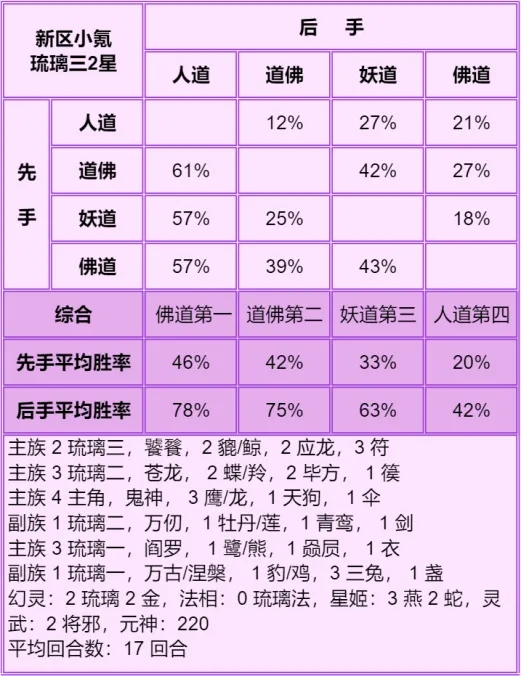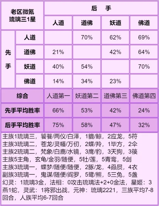 又补测了单5的四族胜率,这个号是单2星琉璃攻击法,单位死的特别快,副核神仙都只能抗2~3回合,所以3+3打不过单5,如果有防御法是差不多的,防御法星高应该是3+3好。