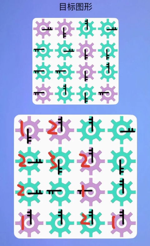 7、在后面更复杂的一些关中,有的齿轮乍一看不需要转就已经在目标位置了,但实际上是需要转4次,有一些乍一看转1次就行,实际上需要转5次。要结合具体情况来判断需要转几次。