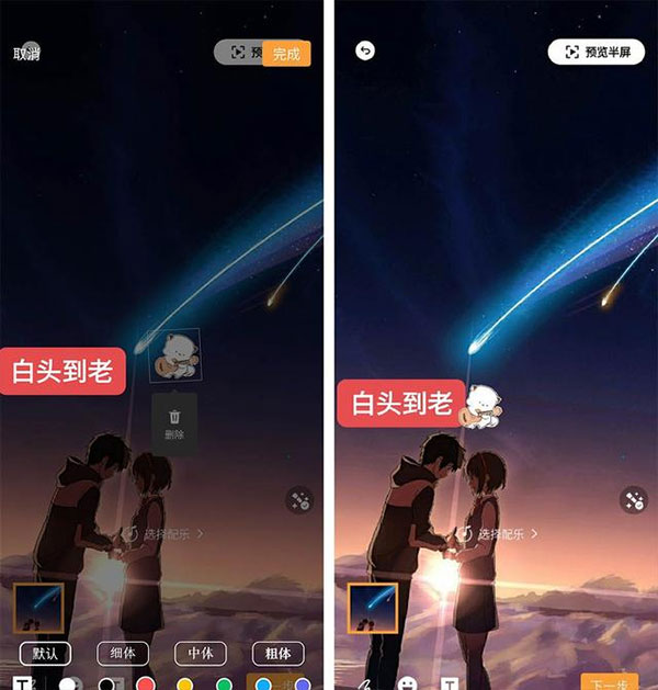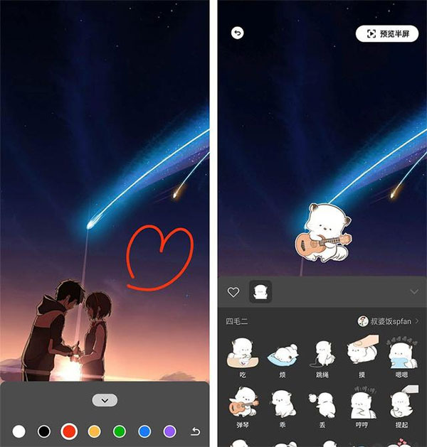 选好素材后点击下一步,在编辑页面中可以进行更为细致的私人定制。左下角的涂鸦工具可以画一些有意义图案;中间表情图标可以添加你收藏的表情包,表情是可以调整位置以及缩放的;