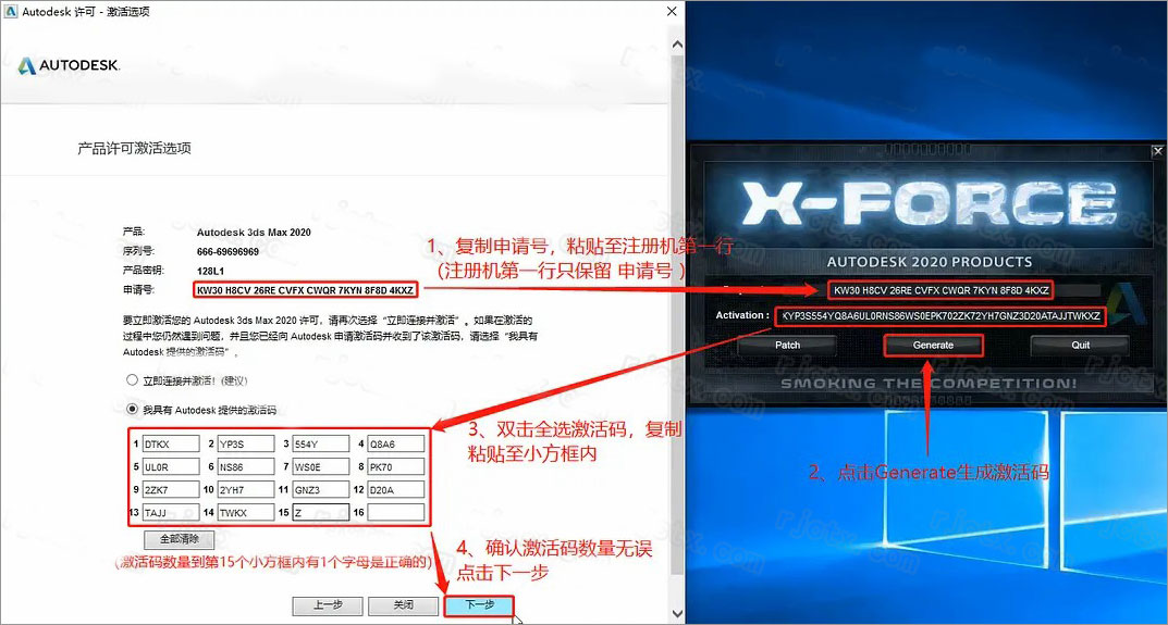 ④ 使用快捷键“Ctrl+C”复制【Activation】后框中的激活码;②使用快捷键“Ctrl+V”将激活码粘贴到【激活码输入框】中