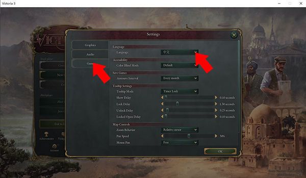 2、点击点击左侧的game选项,并找到Language选项并设置为简体中文并保存修改(修改语言后需重启才可生效)