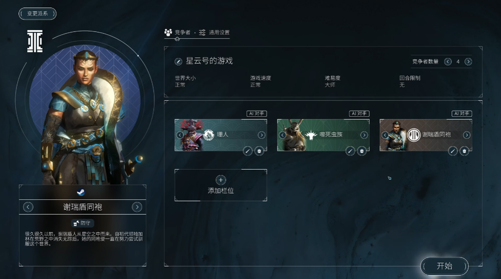 1、在本站下载解压双击启动无尽帝国2,进入后点击开始游戏,接着选择一个派系,以及AI对手;