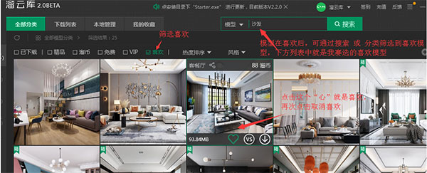 5、在找模型的过程中,如您对模型比较喜欢,可以点击喜欢,模型在喜欢后,可以通过搜索,筛选分类等方法找到,查看素材时,勾选【喜欢】,可查看自己加入喜欢的素材;
