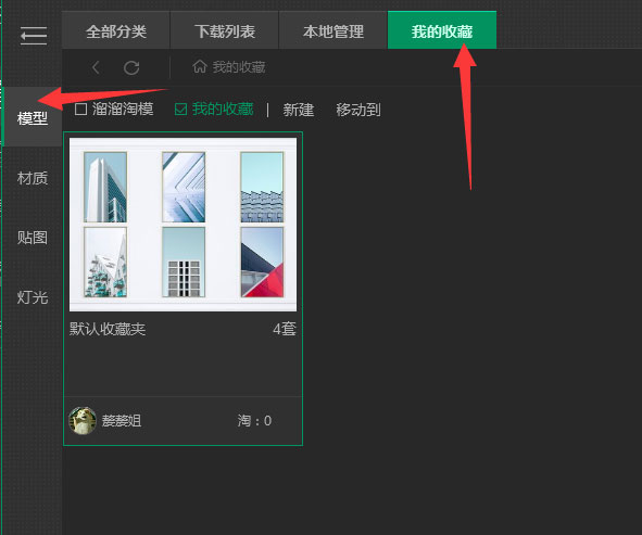8、收藏的素材,需要在溜云库左侧点击对应的分类,如:查看模型的收藏,点击左侧的【模型】;查看材质的收藏,则点击左侧的【材质】;