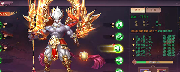 另一位是刑天,最后一位是女娲,小编暂时就一位上古天神蚩尤,每一位上古天神都有进阶和祝福两个功能,今天主要讲进阶功能,如果玩家刚刚拥有上古天神,那么该天神的天府是零阶,防御力和生命力都是0,如果玩家进阶后可以随机获得一条系统所给的属性,是随机的不是玩家可以选择的哦。
