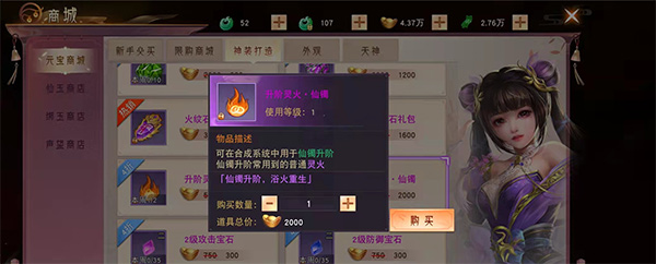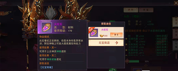 游戏中还有火纹石和升阶灵火等重要道具。火纹石主要用于提升上古天神的属性和战力,可以通过元宝商城获取;而升阶灵火则用于提升装备等级,进一步增强角色实力。新人玩家可以通过完成任务或购买获得这些道具。