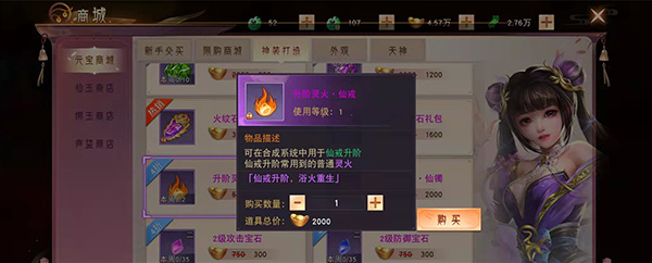 升阶灵火怎样获取呢,想要升阶仙戒和仙镯,就要去元宝商店去购买升阶灵火,玩家在主界面点击商城,在商城中点击元宝商城之后,在右面的界面中就可以看到仙戒升阶灵火和仙镯升阶灵火,每周每种升阶灵火只能购买两次,小编购买时,升阶灵火的价格都是2000元宝一个,暂时没有发现价格的变动。