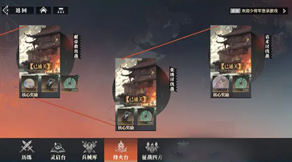 玩法挺多的,主线任务能解锁很多故事线和资源,历练副本可以提升武将等级,灵启台用来觉醒武将,烽火台挑战塔还能解锁貂蝉这样的神将。三山里有休闲玩法,钓钓鱼、听故事什么的挺有意思。兵械库则是装备党的天堂,橙色装备都能刷到。