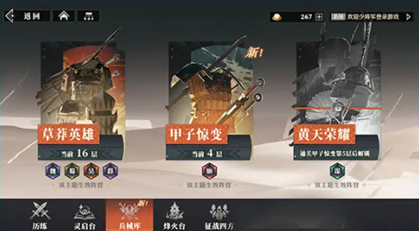 兵械库由三个主题“草莽英雄”、“甲子惊变”、“黄天荣耀”组成,三个主题生效阵营不同,可以理解为三种类型的“装备塔”,通关后可通过兵械库宝地挂机获取装备