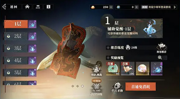 “武将觉醒”副本,三个职业(攻击/防御/辅助)均有10层挑战,通关后可扫荡获得获得1-6阶的武将觉醒材料,是武将觉醒材料的主要获取来源