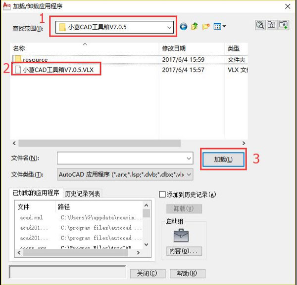 4、选择小葛CAD工具箱VX.X.X.VLX并添加。(不要选择resource文件夹)