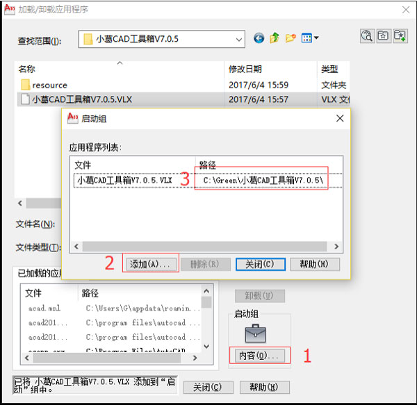 如需要插件每次随CAD自动加载而不需要每次手动加载,则需将插件同时添加到启动组,具体步骤如下: