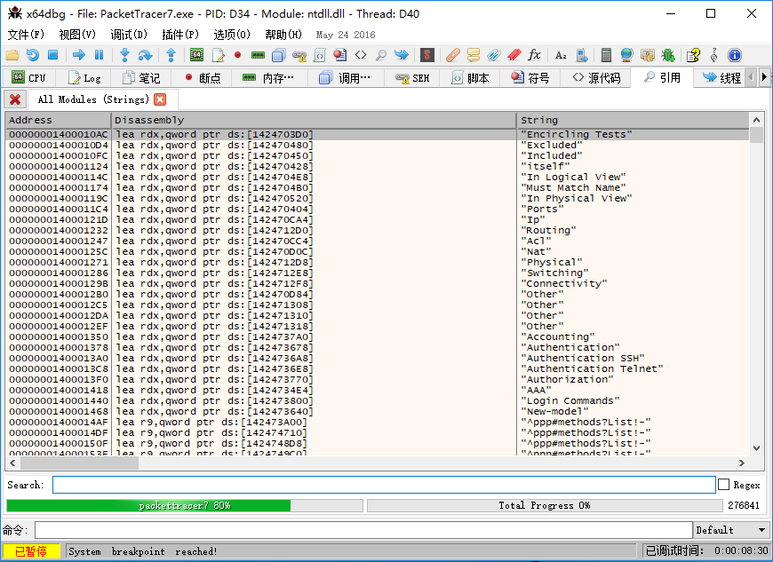 5、然后程序会自动搜索,等下面右边的总进度都跑到100%即可所以,在x64dbg刚刚搜索出来的引用里搜索报错框的内容,看下能不能找到相关的地址。搜索:netacad.com login failed. 可以看到输了前面一句,搜索结果就只剩一个了,而且字符串那行的内容刚好跟报错框的内容吻合。然后选择它,右键--》切换断点,发现它的地址会变红;再次右键--在反汇编中转到;
