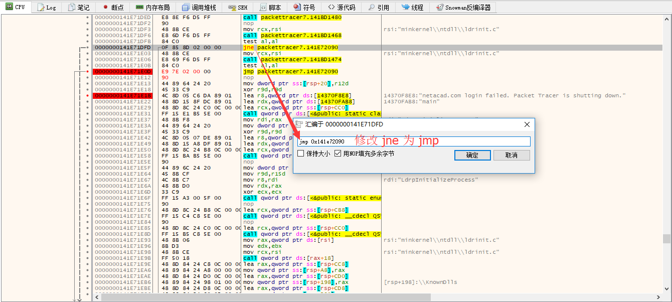 8、修改两处的jne为jmp后的截图如下: