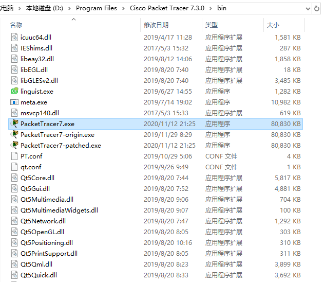 11、关闭x64dbg程序,将原PacketTracer7.exe重命名为PacketTracer7-origin.exe, 并将 PacketTracer7-patched.exe 重命名为 PacketTracer7.exe;