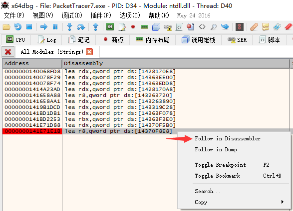 1、在x64dbg官网下载完成后,点击Packet Tracer7.0,用x64dbg打开;