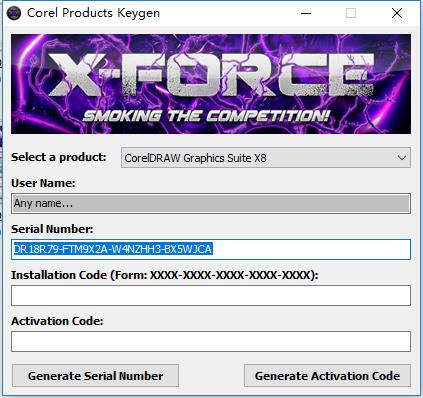 4、成功安装后,打开安装包下的注册机,修改版本为“CorelDRAW Graphics Suite X8”,点击“Generate Serial Number”,然后将序列号复制到安装程序中。