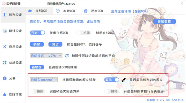 这里可以修改ocr识别相关的设定,如文字方向,是否拼接换行文字,原文语种选择等