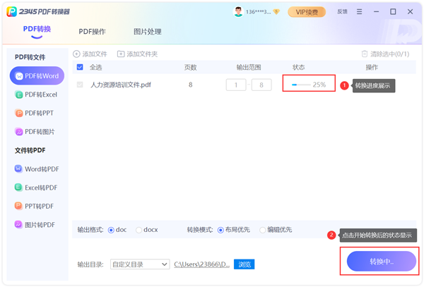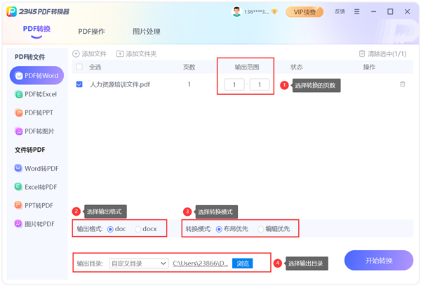 根据需要选择转换页数,确认转换模式,在选择文件保存位置和设置文件格式,然后在开始转换。