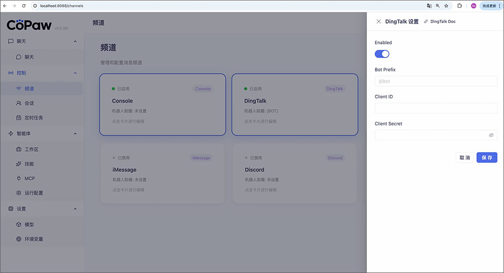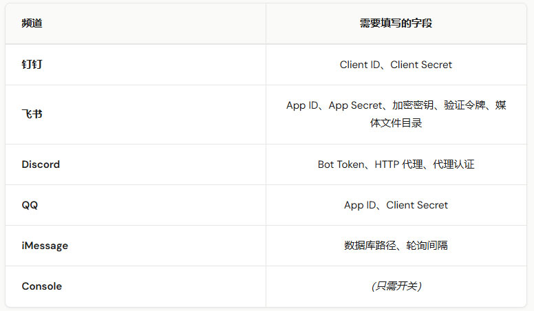 在这里管理各消息频道(钉钉、飞书、Discord、QQ、iMessage、Console)的开关和凭据。