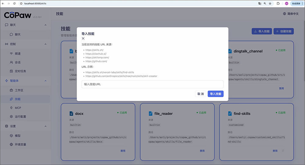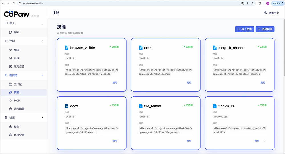 5、Skills 扩展:CoPaw 提供自定义 Skill 开发机制,编写的 Skill 会自动同步到控制台 UI,同时支持从社区 Skills Hub 导入共享能力,实现功能的无限扩展。