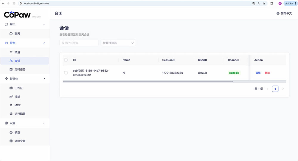 重命名会话: 点击某行的 编辑 按钮 → 修改名称 → 点 保存。