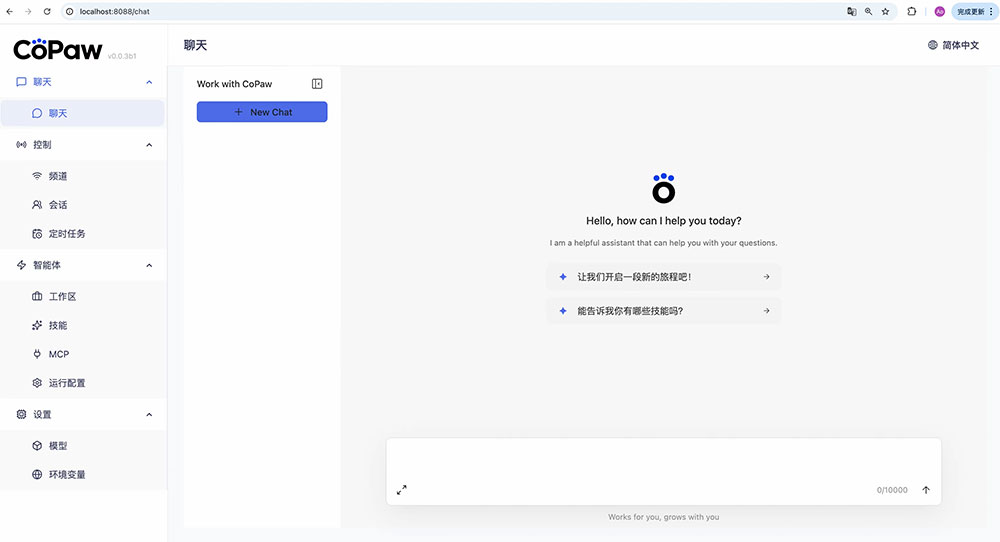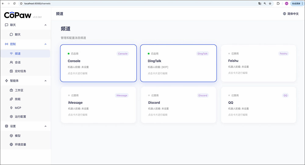 控制台是CoPaw内置的Web管理界面。运行 copaw app 后,在浏览器中打开 http://127.0.0.1:8088/ 即可进入。