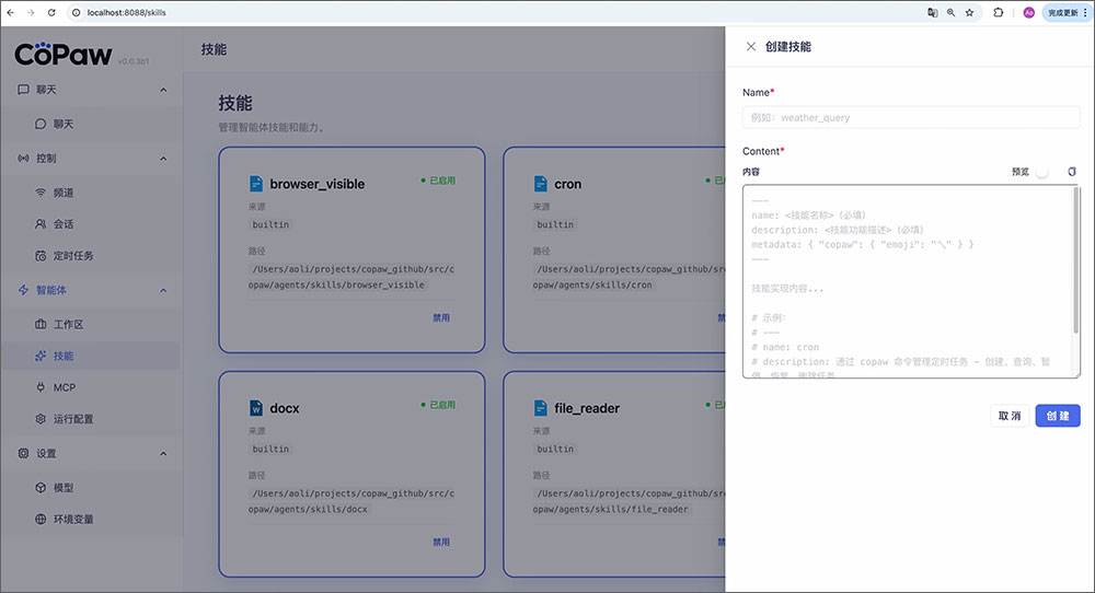 6、开关技能以扩展 CoPaw 的能力