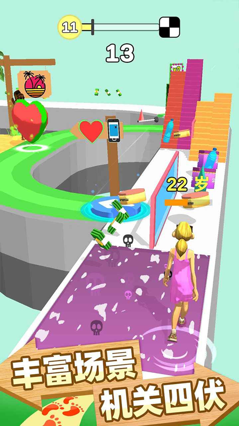 2、玩家在跑酷突破的同时收集道具,让自己变得年轻,更有障碍物关卡挑战;