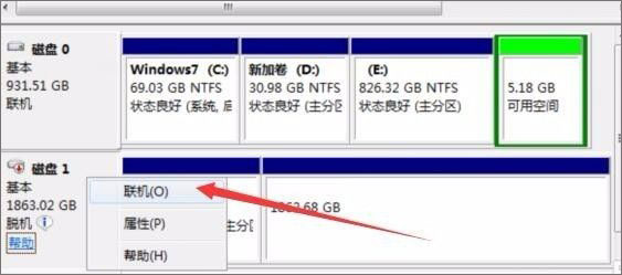 1、右击桌面的计算机图标”-“管理”-“磁盘管理” 可以看到磁盘1中有个1.8T的未分配的空间,这部分空间就是丢失的分区。