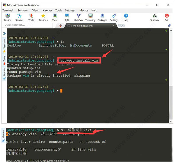 从这个控制台窗口,您将被允许运行您需要的Unix命令:ls,cd,grep,awk,tail,cut,sed,wget,rsync,telnet,ssh,rlogin,rsh ...所有必需的Unix工具存在。如果您需要在基本MobaXterm文件中不可用的程序,则可以下载免费的插件。