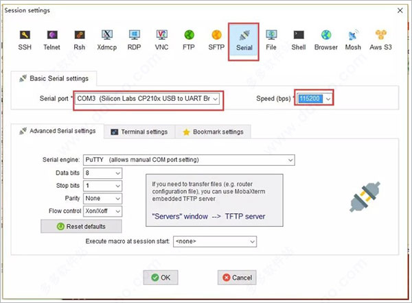 5、在「session setting」 对话框里选择serial,再选好串口号及波特率,点击OK就完成连接了。