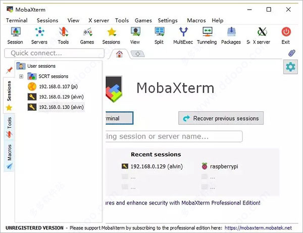 允许您启动远程会话。您可以选择创建SSH,Telnet,Rlogin,RDP,VNC,XDMCP,FTP,SFTP或串行会话。您开始的每个会话都会自动保存并显示在左边栏中。