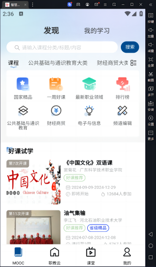 智慧职教icve电脑版是一款基于安卓模拟器运行的移动教学软件,适合学生和社会学习者使用。它涵盖了中职、高职、职教本科等各类课程,并提供选课排行榜功能,方便用户参考热门课程。软件不仅帮助教师管理课程、发送公告、布置和批改作业,还能组织课堂互动活动如签到、提问、讨论、测验等;学生也能通过该软件与教师互动并随时随地学习。