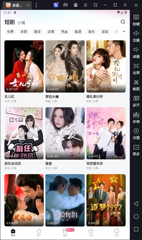 喜番短剧电脑版是一个在PC端运行的短视频播放软件,基于安卓模拟器开发,由快手科技推出。界面设计简单直观,布局清晰,操作起来很顺畅。软件里的短剧类型超级丰富,甜宠、逆袭、热血、武侠等各种题材都有,完全免费观看,弹幕功能也很方便,可以和别人边看边聊,挺有意思的。