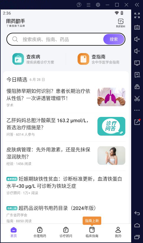 还有“用药指南”收集了数百篇权威指南,并和药品分类关联起来;“患者指导”功能可以将服药方式、注意事项等信息以短信形式发送给患者,挺方便的。再加上医学计算工具和专业资讯更新及时,这个软件确实是个很实用的家庭用药助手。