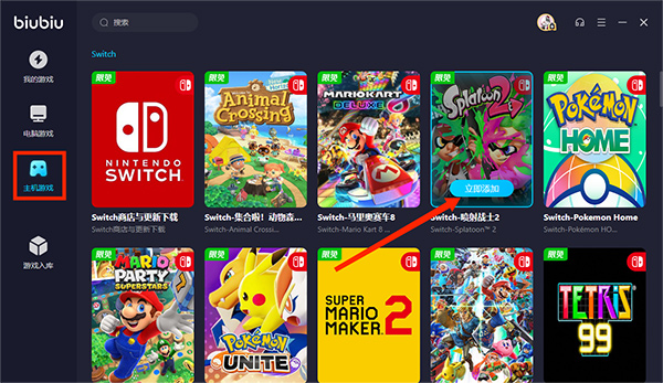 6、在【主机游戏】界面,滑动鼠标滚轮,可看到各种各样的Switch游戏,选择需要的Switch游戏,这以喷射战士2为例,点击【立即添加】选项,如图,返回【我的游戏】界面,可看到喷射战士2已经添加在加速的列表中了,