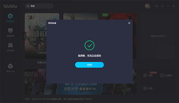 4、出现【恭喜你,实名认证成功】的提示后代表实名认证完成,可以进行游戏加速了。