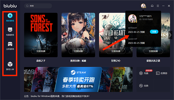 2、登录完成后可以看到用户信息,包括全平台VIP和Switch VIP的到期时间,同时可看到软件界面一共分为【我的游戏】、【电脑游戏】、【主机游戏】和【游戏入库】栏目,