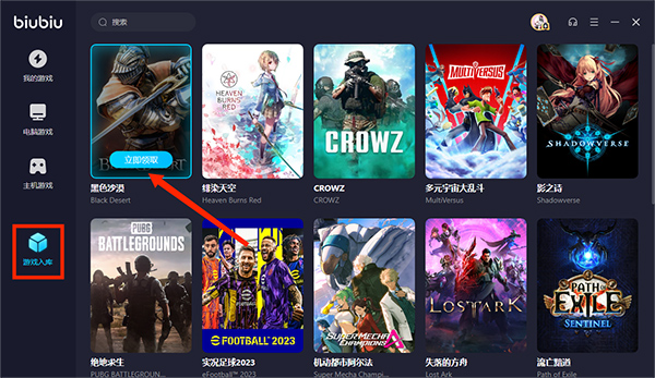 7、在【游戏入库】界面,可以领取支持加速的游戏,这里以黑色沙漠为例,选择【立即领取】就可以了,以上就是biubiu加速器的使用教程了。