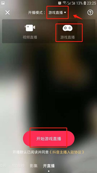 4、在开播模式中选择“游戏直播”,然后点击“开始游戏直播”。