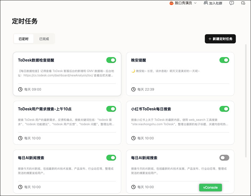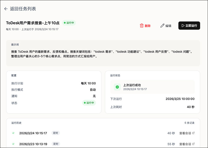 4、定时任务会到点自动执行,执行记录如之前有对应会话,则会在之前会话中显示对应的记录;如之前没对应会话,则会创建一条当前定时任务的会话记录,后续的定时任务执行将显示在此