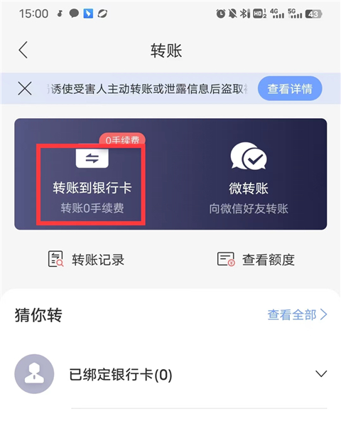 2、里面提供转到银行卡和微信,我们点击转账到银行卡;