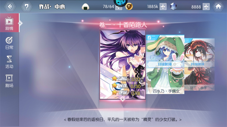 剧情副本以约战的主线故事为大纲,用约会关卡和战斗关卡的显示还原整个约战的剧情,关卡中有丰富的剧情、CG和配音等。