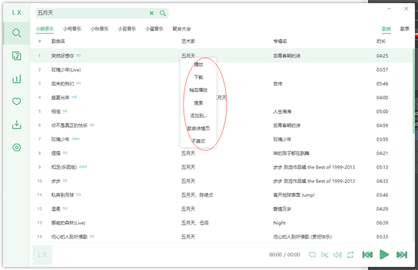 7、❤形按钮显示的是列表,包括播放列表和收藏列表,右键单击歌曲可以进行删除、下载等操作!