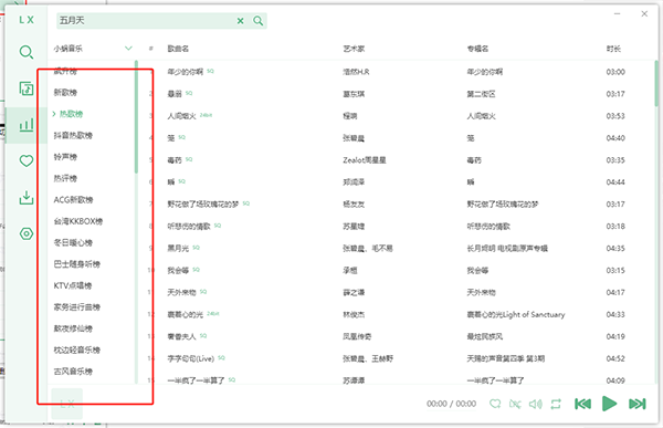 1、左侧功能区一共有五个功能按钮,分别是搜索、歌单、排行榜、列表和设置,哦不!应该说是六个,还有一个下载,不过默认被隐藏了,需要到设置中开启。