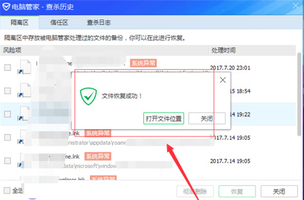 2、在打开的腾讯电脑管家查杀历史窗口中,找到您要恢复的文件,找到文件后在文件前面打钩,然后点击【恢复】就可以了。