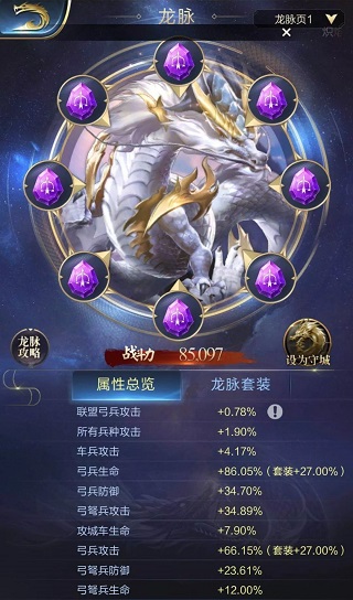这套不算完美的紫色龙脉共为弓兵增加了100%的攻击加成和98%的弓兵生命加成。即使不算套装效果和联盟属性提升,就已经相当于满战争值下的40级弓兵攻击技能加上满兵法“必中”技能提供的攻击加成。更不用说之后获得更优的属性以及橙色龙脉的提升了。