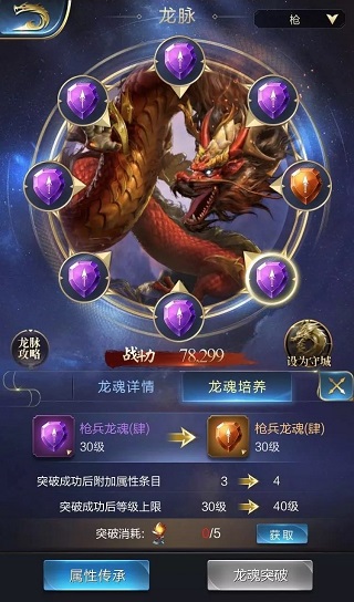 仍然以性价比较高的紫色套装为例,第一步肯定是将龙魂凑齐想要的套装效果。这里就需要通过突破的方式来提升龙脉品质,更有效地帮你凑齐套装。