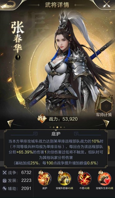 张春华专属技能【庇护】,可以让己方每一排的攻城车在满足一定战斗力后,为己方远程部队分担65.39%的伤害1次,用高血防的攻城车为脆弱的远程部队承伤。